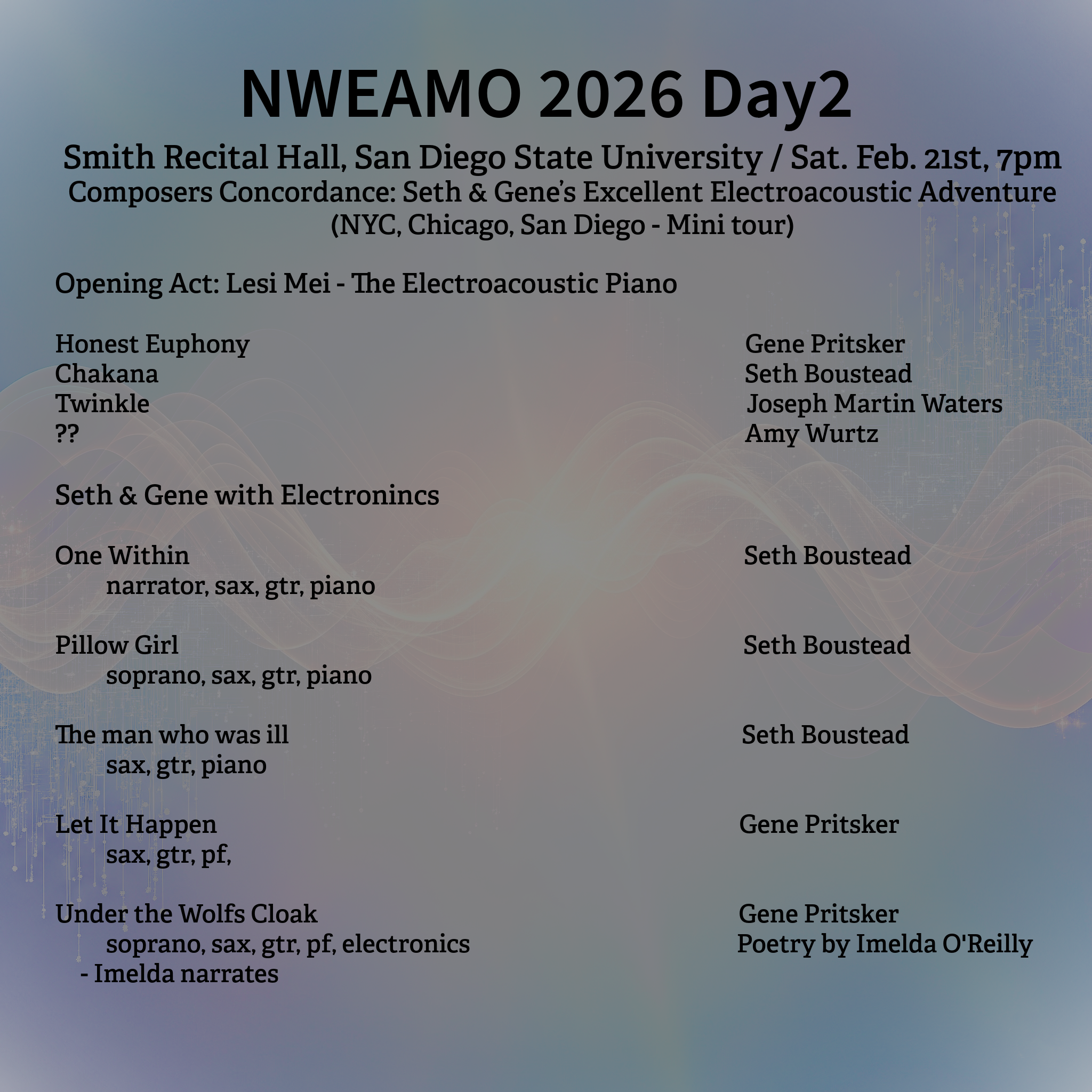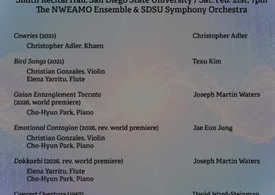 Press Material for NWEAMO 2026 Download 2026Press Release PDF Twinkle by SWARMIUS https://nweamo.org/wp-content/uploads/2026/01/Twinkle_111125_2448.mp3 Texu Kim hard at work on music composition Click for larger images